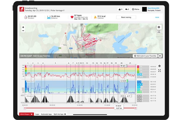 スノーボードで「Hill Splitter」を利用した結果。さまざまな数値を一覧できる。下部のグラフは、上から心拍数、走行ペース、アップヒル/ダウンヒルの高度