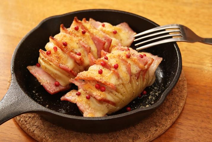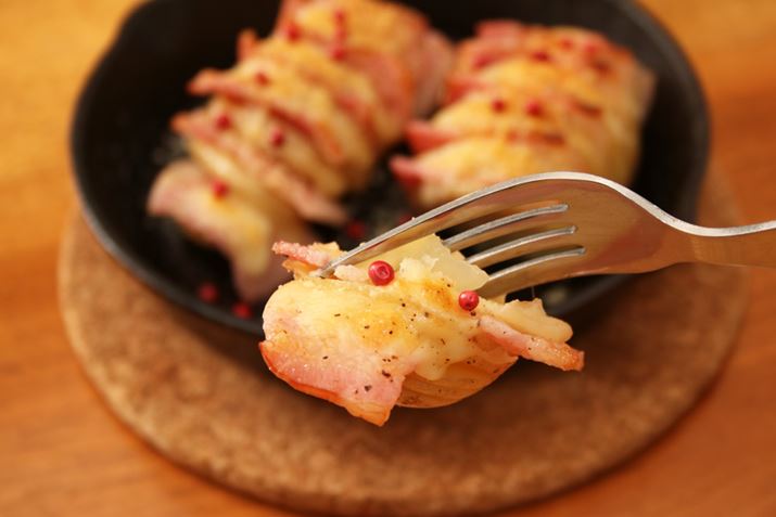 じゃがいもは電子レンジでやわらかくしましたが、グリルで焼き上げることで表面が香ばしくなりました。ベーコンとチーズのほどよい脂加減とも相性がよく、スキレットで温かいうちにすべて食べきってしまったほどのおいしさです