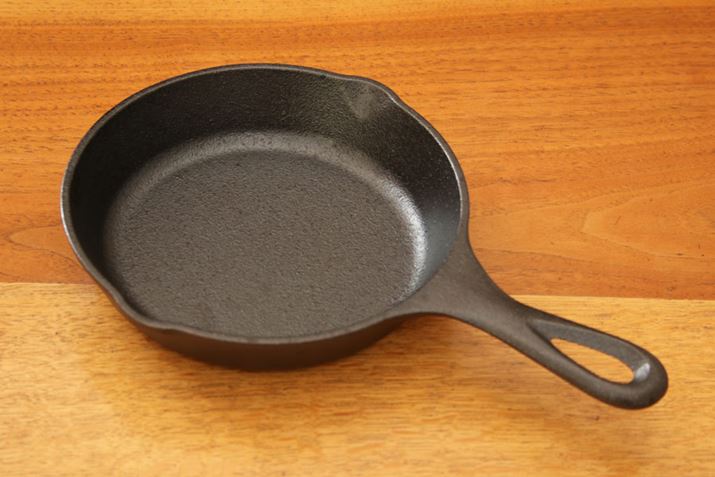 一般的なスキレットはフライパンのような形をしており、分厚い鋳鉄でできています。写真はロッジ「スキレット 6-1/2 インチ L3SK3」