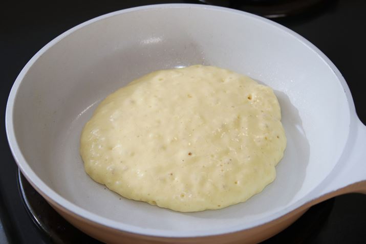 蓄熱性が高いことで、どれほど焼き上がりに差が出るのかをアルミ製フライパンと比べてみます。焼くのは、ホットケーキ。フライパンを熱したあと濡れフキンでいったん冷まし、ホットケーキミックスの生地を流し入れ約3分加熱。その後、裏返して約2分焼くという、オーソドックスな作り方です。ふくらみやすい“ちょい足し”食材も入れていなければ、フタもしていません。