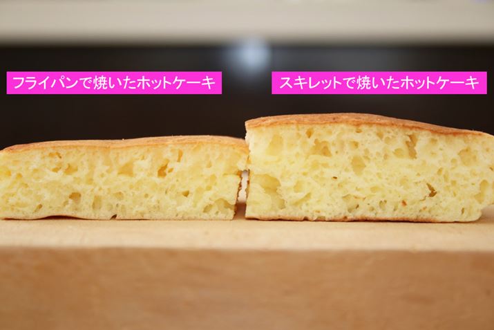 アルミ製フライパンで焼いたホットケーキの厚みは約1.5cmで、スキレットのほうは約2cm。スキレットで焼いたホットケーキは気泡が大きくふくらみ、厚みが出たようです。歯触りはフワフワでやわらく、いつも作っているホットケーキが道具を変えるだけでよりおいしくなりました