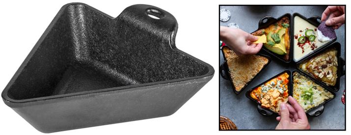 ロッジ「10OZ トライアングルミニサーバー HMST」。サイズは155(幅)×160(長さ)×55(高さ)mmで、重量は約653g。1個で使うだけでなく、複数個組み合わせるとテーブルがより華やかに演出できます。IH対応