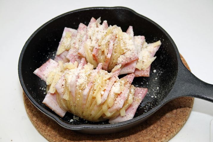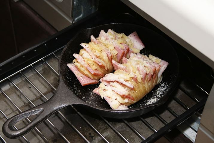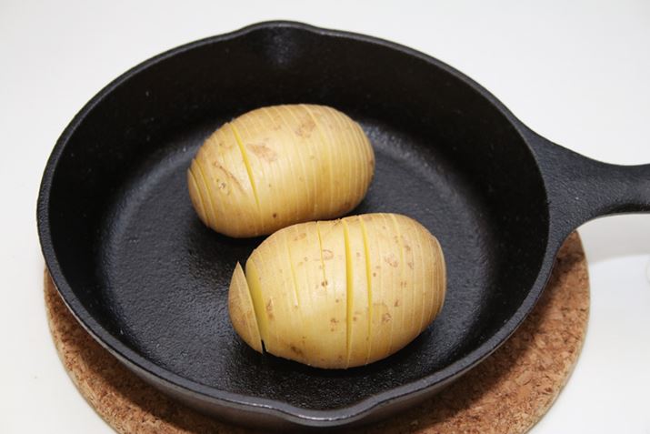 アメリカを代表する老舗メーカー「ロッジ」の6-1/2インチサイズのスキレットは、直径約16.5cmと小さめ。ひとり分のプレートとしてちょうどいい大きさなうえ、コンロに装備されている魚焼きグリルにも入れられます。今回は、そのコンパクトさを生かしてハッセルバックポテトを作ってみましょう。