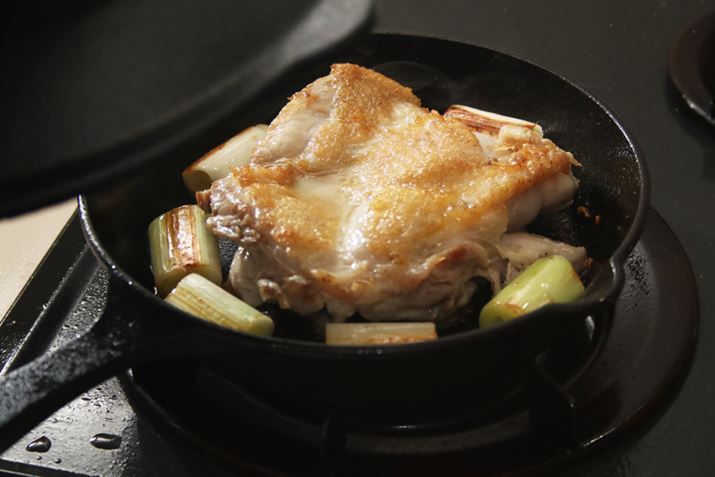 鶏肉の周囲に長ネギを散らし、フタをしてさらに加熱。約2分経過したタイミングで長ネギを裏返し、もう1度フタをして約2分焼きます