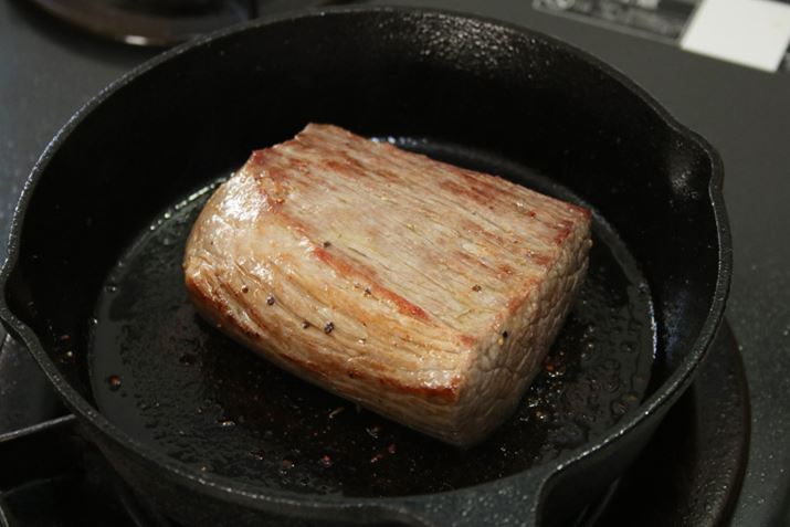 まずは、普通のフライパンのようにひとつだけ使用。加熱したスキレットに、ハーブソルトを振った牛ももブロックを載せ、裏表だけでなく側面にも焼き色を付けます