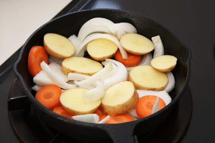 牛肉の表面に焼き色を付け終わる前に、もうひとつのスキレットも準備しておきましょう。加熱したスキレットに、スライスしたたまねぎ、にんじん、じゃがいもを投入