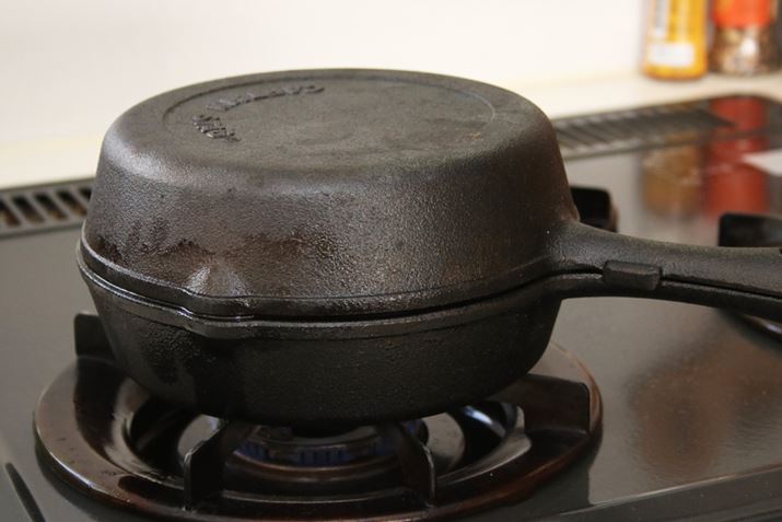 そして、牛肉を焼いていたスキレットをフタのように重ねてください。こうすることで、下からの加熱だけでなく、重ねたスキレットの余熱で上からも加熱されます。なお、重ねる前に洗う必要はなく、そのままかぶせてOK