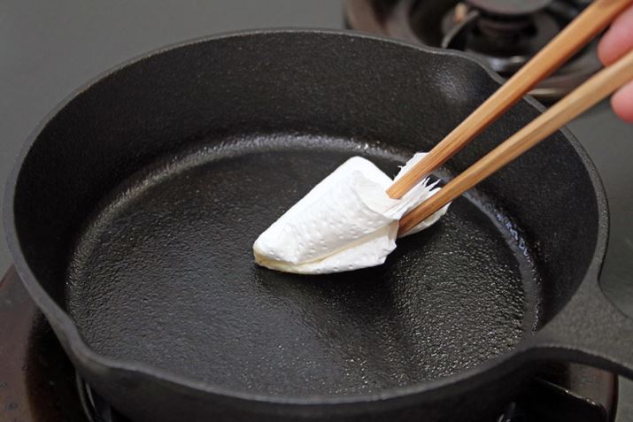 汚れが落ちたらコンロで火にかけ、水分を飛ばします。そして全体にオリーブオイルなどを塗布。サビを防ぐとともに、油がなじむことで焦げ付きにくくなります
