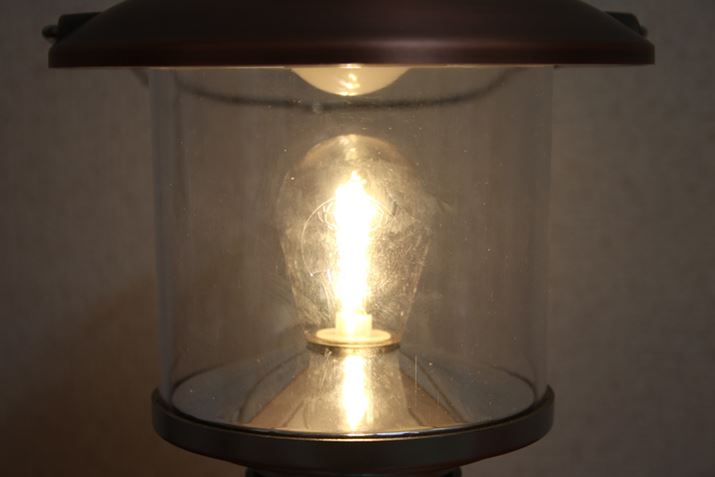 標準の状態で点灯した明かりは、シャープな印象。エジソン球タイプのLEDを電球のようなデザインにした光源を採用しています
