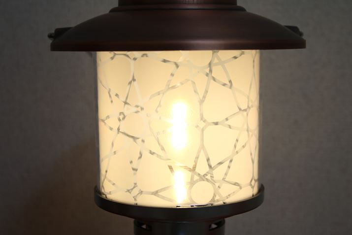 ステンドグラス風シートをセットした状態。ボディはABS樹脂製ですが、ブロンズ調に仕上げられています。サイズは約16.5(直径)×33(高さ)cmで、重量は約770g