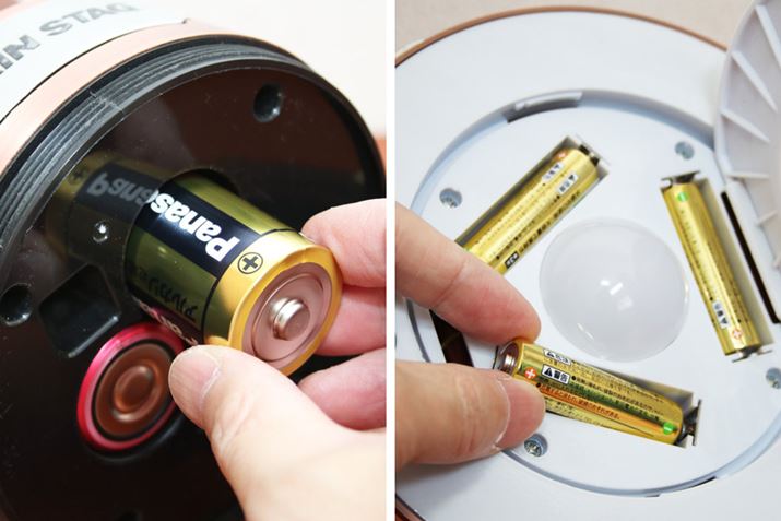 本体とカサ部を同時に点灯させるには、それぞれに乾電池が必要。本体には単1形乾電池3本、カサ部には単3形乾電池3本をセットします