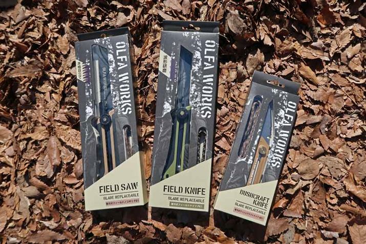 上から順に、「替刃式フィールドノコギリ FS1」(販売価格2,000円/税別)、「替刃式フィールドナイフ FK1」(販売価格1,400円/税別)、「替刃式ブッシュクラフトナイフ BK1」(販売価格1,300円/税別)。中央の替刃式フィールドナイフ FK1がサンドベージュで、残り2製品がオリーブドラブというカラーだ