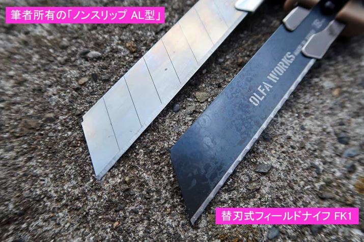 従来の刃が先端から5mmくらいずつ折りながら使えるのに対し、フィールドナイフの刃は折る構造にはなっていない