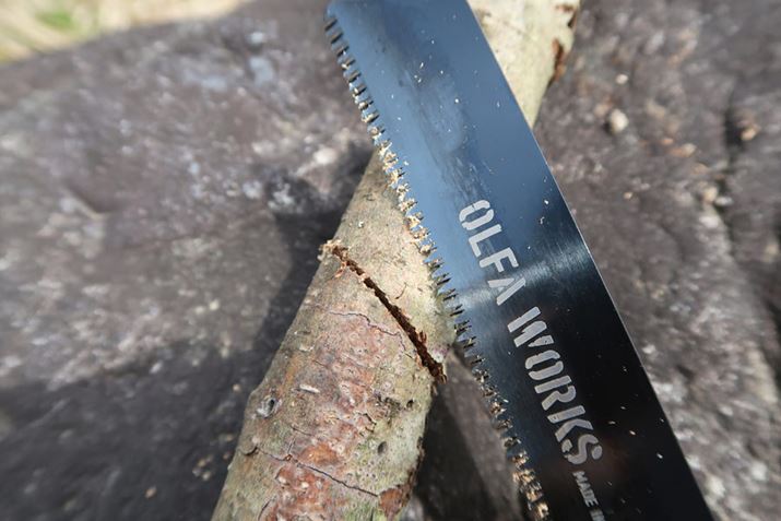 最後に、「替刃式フィールドノコギリ FS1」(以下、フィールドノコギリ)である。繰り返すが、これはナイフではなく、ノコギリ。ナイフ以上に刃を前後させて使うものだけに、力を入れやすいよう、もっとも大型になっている。以前から販売している小型ノコギリを、アウトドア仕様に変更したのだろう。僕はこのサイズのオルファのナイフやノコギリを所有していないため、前述の2アイテムのように従来のものとの比較はできないが、お許しいただきたい。