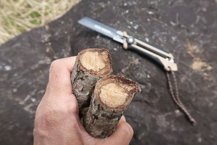 ここからはこの3種のアイテムを実際に使った様子をお伝えしていく。ただ切れ味を試してもつまらないので、木の枝を使って箸を自作してみることにした。