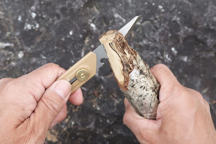 ここで思うのは、フィールドナイフの刃が「オルファ」のように“折れる”刃だったら、木を削る作業が難しかっただろうということだ。“折れる”刃は先端の切れ味を保つためには有効だが、刃を長くして使っていると強い圧力がかかった際に折れやすい。それも、強いテンションがかかった刃はただ折れるわけではなく、折れた瞬間に弾き飛び、とても恐ろしい存在になる。だが、一般のオルファの刃と違って折れ目が入っていないからこそ、フィールドナイフの安心感は非常に高く、ケガをする心配も減るのである。