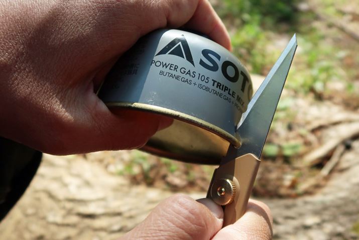 くぼみをガス缶の底部に引っかけて力を加えれば、サイドの壁に穴が空けられる。廃棄する前に簡単にガス抜きができ、とても便利だ