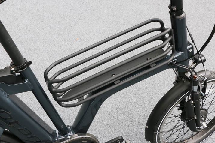 フレーム中央部にあるバスケットのサイズは約8(幅)×40(長さ)×12(高さ)mm(筆者計測)。パイプを組み合わせたような形状で、おしゃれ度も高い。なお、バスケットは工具を使って取り外すことができ、そのネジ穴に市販のドリンクホルダーを取り付けることも可能だ