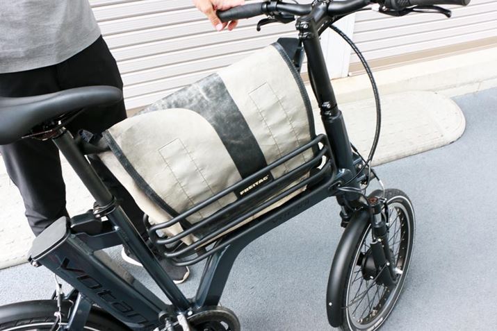 実用性を高めるために装備されたバスケットにバッグを入れて試乗する。筆者所有のメッセンジャーバッグは少し大きめだったが、きっちり収納できた。しかし、バスケットが浅いので、バッグの大半はバスケットからはみ出た状態だ。走行中の振動で落ちてしまわないか心配……