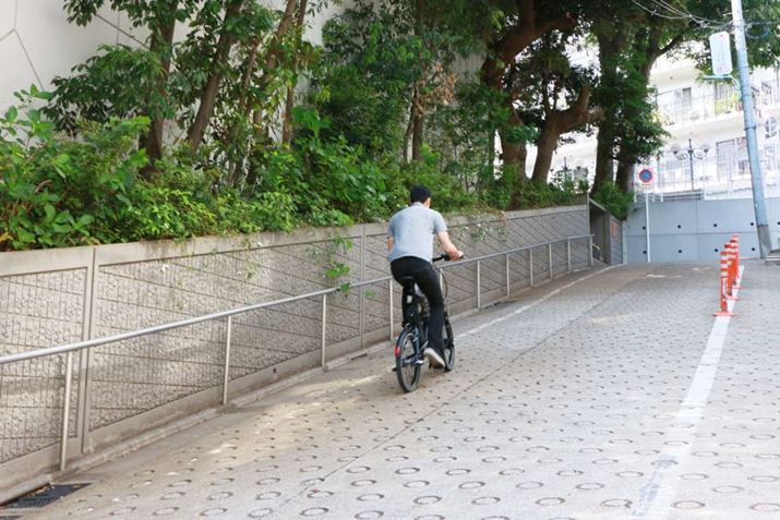 街中では、階段にも遭遇する。H3はコンパクトで、車重も19.5kgとシティサイクルタイプの自転車と比べると軽量だが、持ち上げることを前提とした設計ではないため、力に自信がない人は階段は迂回したほうがいいだろう。