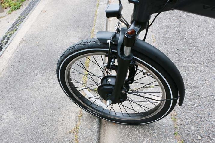 前輪の車軸と一体化したハブモーターを採用。すっきりとしたデザインにひと役買っている