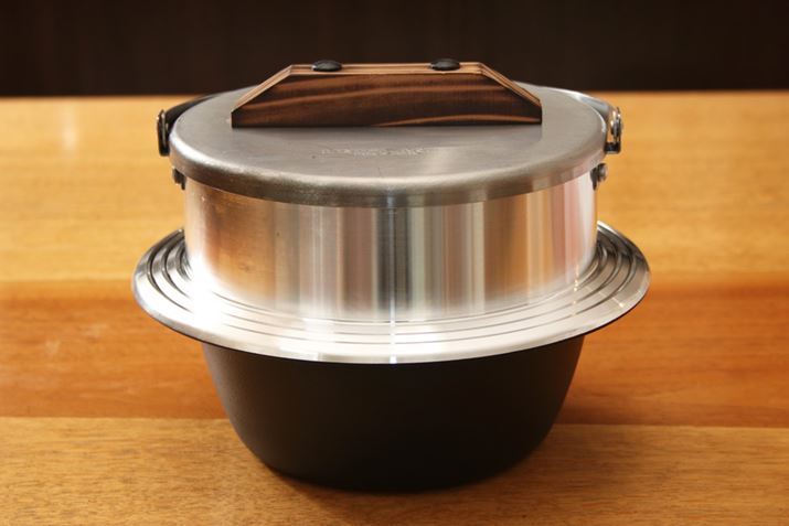 キャンプでごはんを炊く方法は、飯ごうやライスクッカー、ダッチオーブン、普通の鍋などいろいろありますが、基本的に直火で加熱します。家で使う炊飯器のように火加減や加熱時間をおまかせにできないため、慣れていないと失敗することがあるものの、やっぱり直火で炊いたごはんはウマイ! 今回紹介する「キャンプ羽釜 5合炊き」も、もちろん直火で使用するものとなります。釜には蓄熱性にすぐれる肉厚のアルミを採用し、釜底に向かって狭くなる“すり鉢形状”とすることで、炊飯時の対流を起こしやすくして加熱ムラを低減。さらに、重さのあるフタで釜内に圧力をかけ、高温を維持したまま炊飯することにより、昔ながらのかまどで炊いたようなふっくらとしたごはんを炊き上げます。