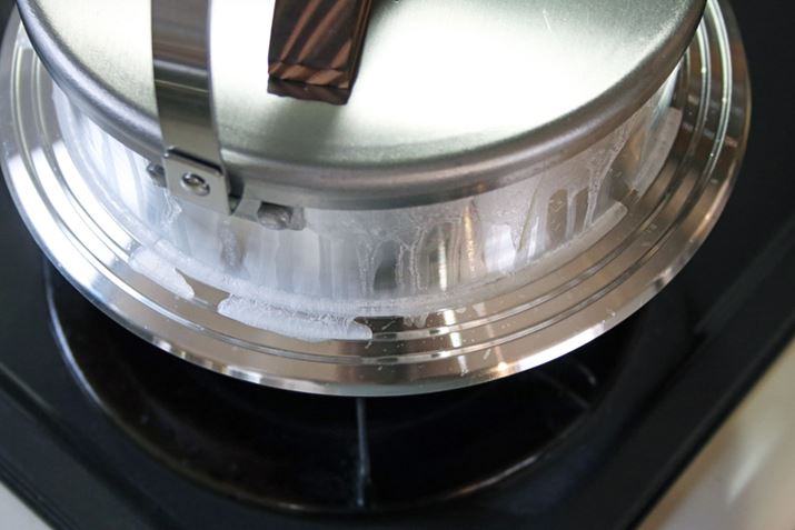 加熱してから約11分30秒で、噴きこぼれ始めました。沸騰でできた泡が当たっても、フタが浮き上がることはありませんでした