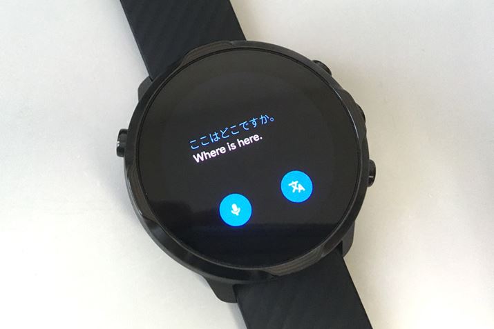 アプリ「Google翻訳」も本体に直接ダウンロード可能。音声認識にも対応しているので、スマホを取り出さなくても翻訳してくれる。使い方はスマホ版「Google翻訳」と同じで、「マイク」のボタンを押してから話すと数秒後に翻訳が完了する