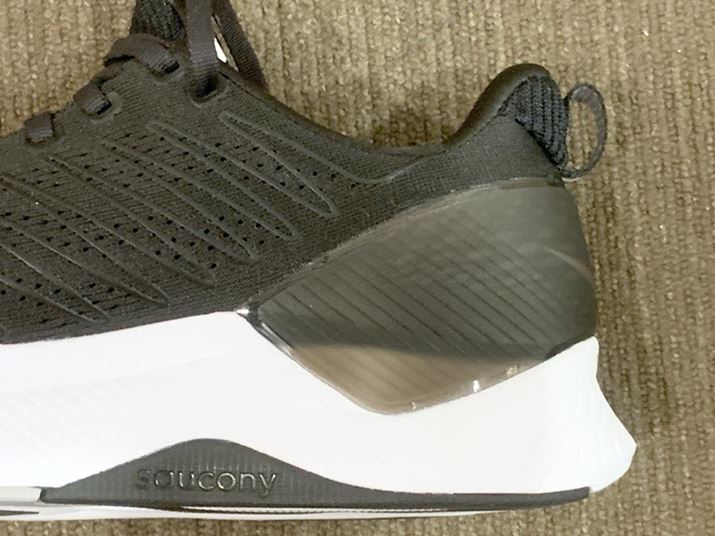 シュータンの両サイドをアッパーに固定した構造は、すぐれたフィッティングを提供してくれるが窮屈感はない。立っている状態では、「エンドルフィン プロ」と「エンドルフィン スピード」の上位2モデルのミッドソールがフワフワした感覚なのに対し、こちらは沈み込みがほとんど感じられず、カチッとした安定感を覚える。これはミッドソール自体の硬度も理由にあげられるが、外付けヒールカウンターを下方向に伸ばしたデザインと、アウトソールの内側を一部巻き上げた構造が大きく寄与している。