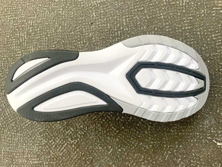 軽量化のためにラバーの使用は最小限に抑えたアウトソール。前足部の「スピードロール」という弧を描くソール形状が、着地から蹴り出しまでの、スムーズに転がるような走行感を生む