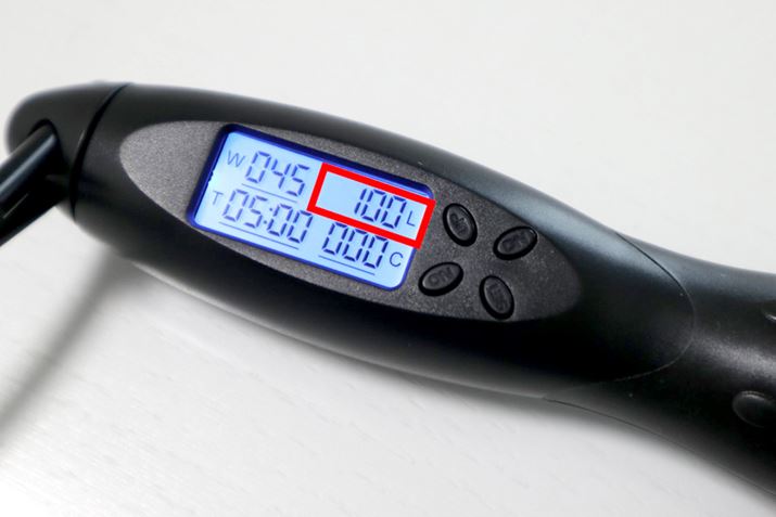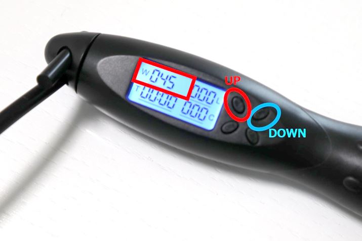上の「UP」「DOWN」を押して自分の体重を登録します。体重が登録できたら右下の「SET」ボタンを押します。体重は20〜120sまで設定することができます。体重を登録しておくことで消費カロリーを算出することができますので正直に!