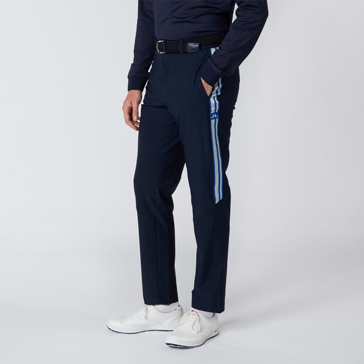 サイドにストライプテープがデザインされたスポーツトレンド感あふれるアイテム。Jリンドバーグでは定番の”マイクロハイストレッチ”素材を使用しています。膝までのサイドラインなので、裾上げも簡単に行えます。カラーはネイビーのほか、ブラックとホワイトが用意されています。