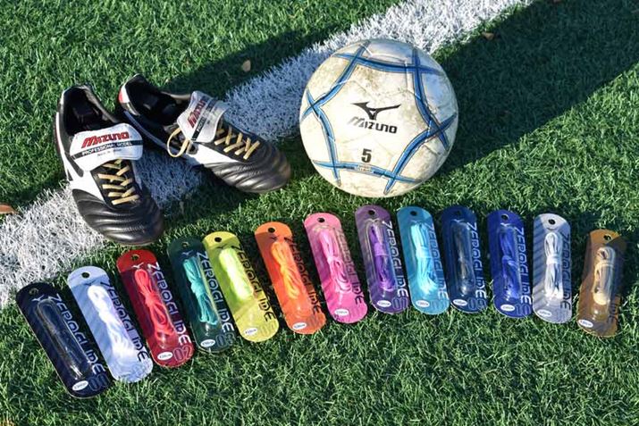 「ゼログライドシューレース」は、ほどけにくさを追求した靴ヒモ。表面には特殊な樹脂加工が施されており、ミズノの通常サッカーシューズ(「モナルシーダネオセレクト」)のシューレースと比べ、表面のグリップ性が約120%向上しているという。さらに、幅は約4mm、厚みは約0.9mmの薄型に仕上がっており、足の形にフィットしやすくなっている。これらにより、スポーツ時でもヒモがほどけにくく、シュータンがズレにくく、加えて高いフィット感も実現したのである。