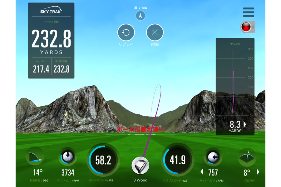 お借りしたスペックはSスレックスの3W(15°)。こちらも、まずはドライバーでのヘッドスピード40m/s相当で試打。重心が深いからか、このヘッドスピード帯でもSIM2 FWより打ち出し角が高くなります。