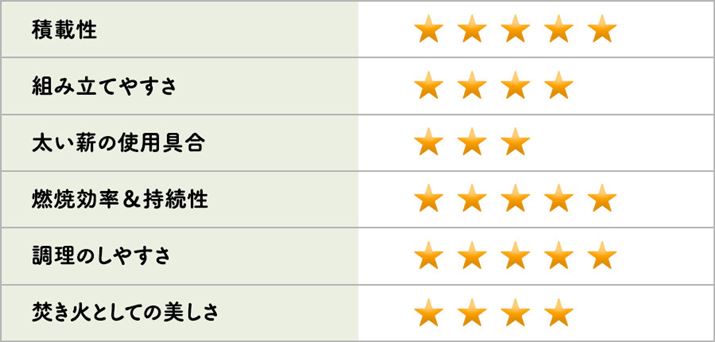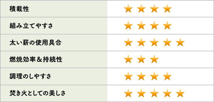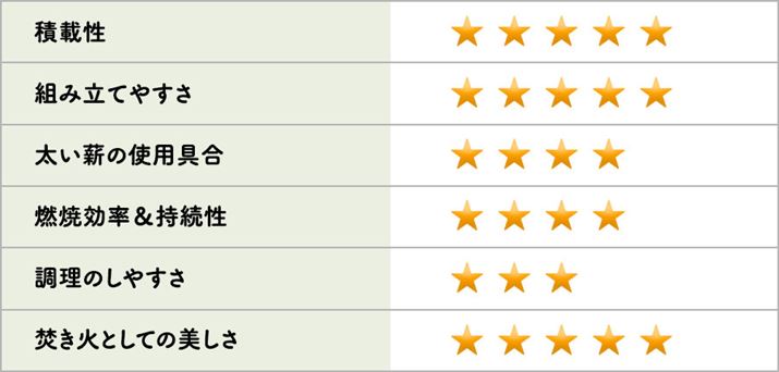 薪が燃え尽きるのは早いが、薪をくべやすく、新たに投入した薪への燃え移りもスピーディーなので、ゆったりと鑑賞できる。ただし、風よけがなく火床の位置も高いため、風の強さによっては工夫が必要