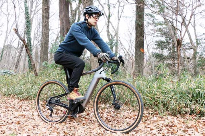 本格的なトレイルに入っても、軽い走行感は変わらない。e-MTBで走るよりもペダリングが軽く、速度の乗りもいいので気持ちよくなっていき、どんどんペダルを回してしまう。フラットな未舗装路では、ドロップハンドルらしいライディングポジションで風を感じながらグイグイ進むような走り方もできる。筆者がこれまで試乗してきたe-MTBよりもあきらかによく進む。未舗装路でも、速めのペースを維持して走るのが気持ちいい自転車だ。