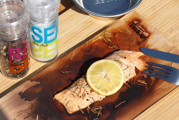 シダーグリルプレートを水に浸して2時間以上経過したら、食材の準備に着手。レモン汁、塩、コショウをサーモンに振り、オリーブオイルを塗ります