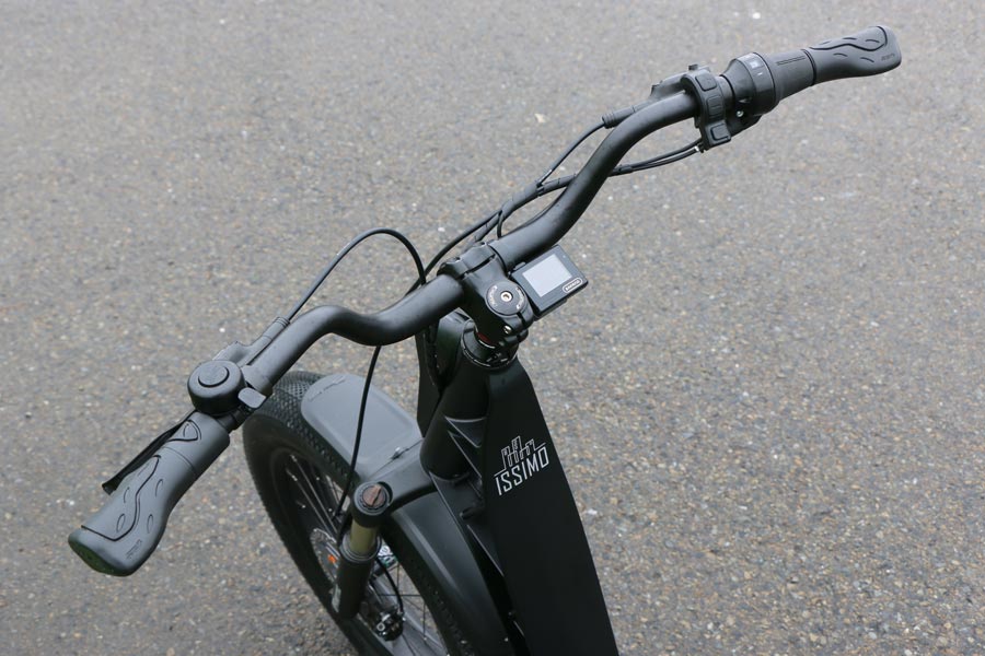 乗り降りしやすそうな形状だが剛性の高そうなフレームに20×4インチの極太タイヤを履き、フロントサスペンションやパワフルなドライブユニットを搭載した車体構成は、ほかにはなかなかない。ゆえに、実際に乗ってみなければ乗り味はわからなそうだ。ということで、街中から未舗装路まで走ってみようと車体にまたがった瞬間に、ISSIMOの独自性が感じられた。着座位置がやや後ろめなのに対しペダルが前側にあるので、クルーザータイプのバイクのような乗車姿勢となるのだ。