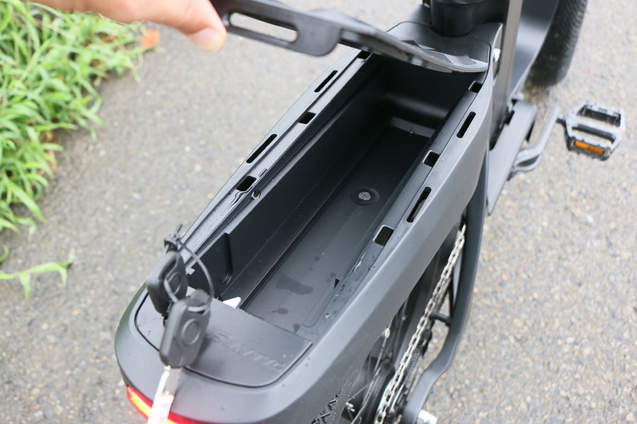 リアキャリアは収納できるようになっている。施錠もできるので、使い勝手はいいだろう。予備のバッテリーを入れられるほどのサイズだが、バッテリーを収めるとフタは閉まらない