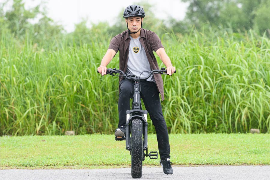 今回試乗した車体はタイヤの空気圧が低めだったが、極太のタイヤは簡単に凹むくらいの空気圧のほうが凸凹を吸収してくれるので乗り心地がいい。アシスト機能がないとかなり体力を消耗しそうだが、強力なドライブユニットを装備しているので、快適さだけを味わうことができた。