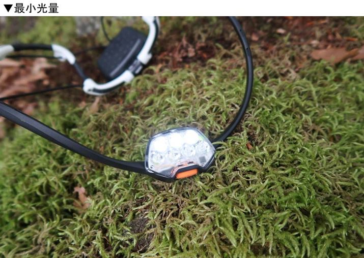 前方7〜8mを照らした時と足元2〜3mを照らした時、どちらの場合も「標準光量」がちょうどよかった。行動中は「最大光量」でもよいが、バッテリーの消費を考えれば、ルートを確認する時や危険個所を探す際などにワンポイントで使うほうがよい。それに対し、「最小光量」ではさすがに歩きにくく、宿泊時に身の回りを照らす時に使うのが現実的だと思われた。