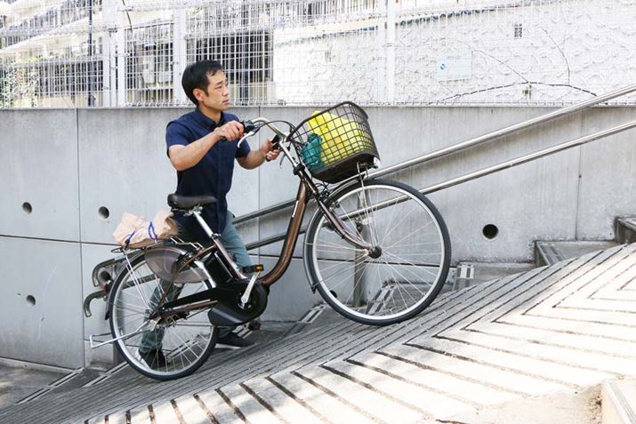 かなり傾斜のきついスロープで、総重量37kg(車体が24kgと荷物が13kg)の自転車を押し歩くのは初めての経験だったが、重い! 登れないことはないが、実生活でこの状況になったら、遠回りしてでもスロープを避けたいくらいのツラさだ。「押し歩きモード」をオンにしても車体や荷物の重さは感じるものの、歩みに合わせて自転車が進んでくれる感覚がある。自転車を前から引っぱってもらっているような感じだ。そのおかげで、階段を登る足も若干軽やかになり、車体を押す腕の力も少なくて済んだ。体への負担や必要な力の差が想像以上にあって、おどろいた。