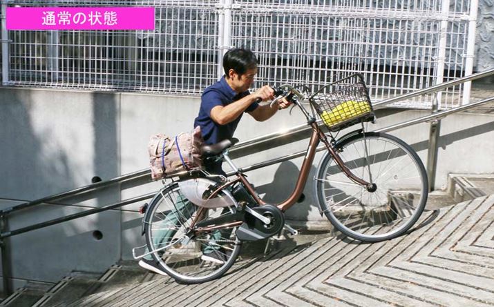 実際に試してみると、押し歩き機能は予想以上にラクだった。平地よりも登り坂、空荷よりも重い荷物を積んだ状態でありがたみを痛感する。自転車の押し歩きは、ただ前に進むだけでなく、車体が倒れないようにもしなければならない。車体や荷物が重くなればなるほど、車体は不安定になり、転倒のリスクも高まる。力を入れるのに必死になると、周囲への注意も散漫になるので、安全性においても押し歩き機能が使えるほうがいいのは間違いない。
