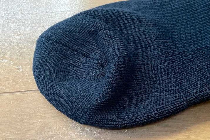 つま先(上)とかかと部(下)は、補強糸を使用することで、ソックス全体の強度を向上させている