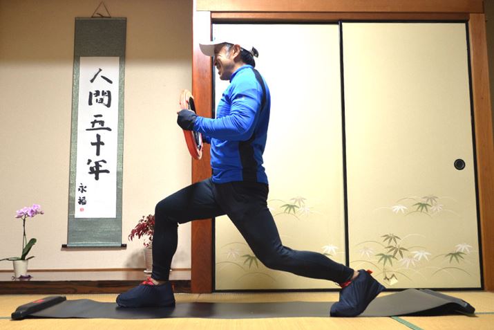 スピードスケートのように「足を滑らせるエクササイズ」で、主に下半身を強化できるものです。