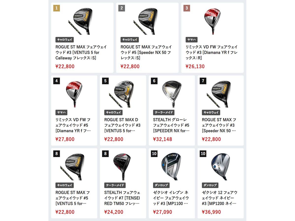 1位は先月に続き、キャロウェイ「ROGUE ST MAX#3・純正シャフトVENTUS 5 for Callaway・S・15度・174cc」が入った。平均価格 35,600円、最安値 22,800円で先月より5,000円程度価格が上がっている。2位にも同モデルの番手、シャフト違い「ROGUE ST MAX#5・純正シャフトSpeeder NX 50・S・18度・148cc」がランクイン。「ROGUE ST MAX」FWは、「FLASH フェースSS22」という技術を搭載。フェースカップの素材には高強度の素材C300マレージング鋼素材を採用し、ボール初速を上げる設計だ。また、シャローフェースで球が上げやすいのも特徴である。7位にも同シリーズの「ROGUE ST MAX #3・純正シャフトSpeeder NX 50・S・16度・181cc」、8位タイにも同シリーズの「ROGUE ST MAX #5・純正シャフトVENTUS 5 for Callaway・S・18度・148cc」が入っており、「ROGUE ST」シリーズがベスト10に4製品入る人気振りを見せた。