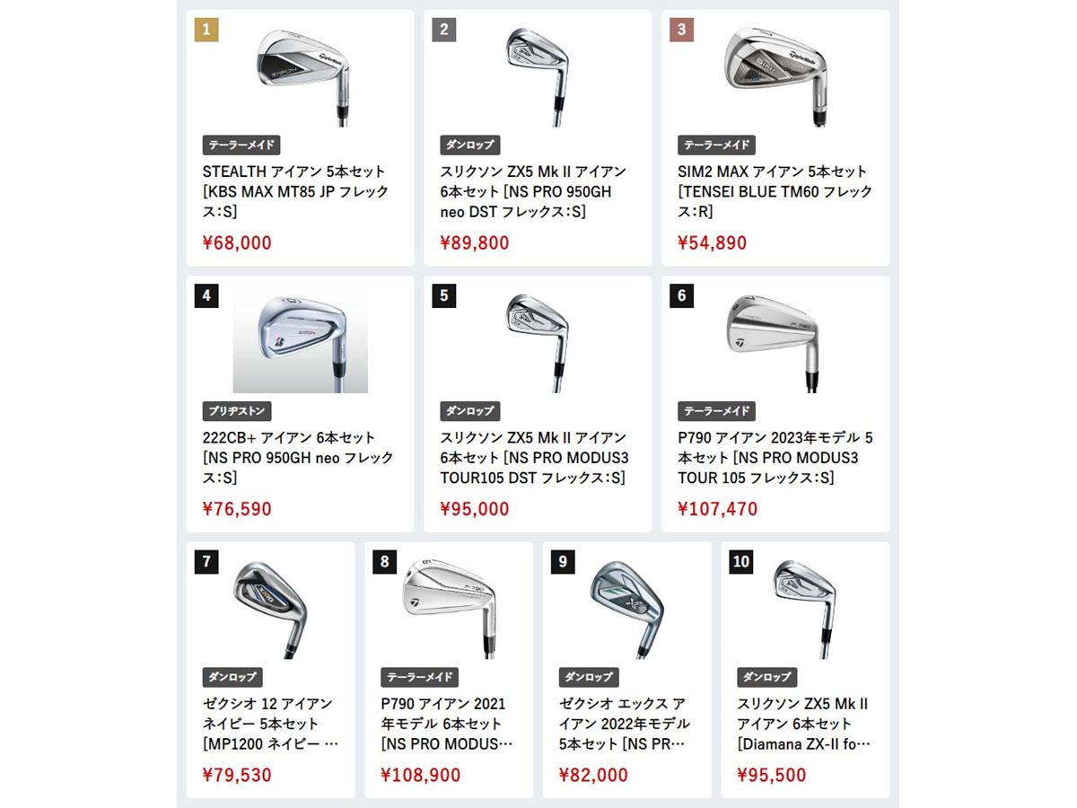 6位にも同社から2023年9月に発売された新商品「P790 アイアン 2023年モデル 5本セット・NS PRO MODUS3 TOUR 105・S」が入った。平均価格 133,658円、最安値 107,479円である。アスリートゴルファーが求めるコントロール性能や飛距離性能と寛容性に加え、見た目の美しさも追求。番手別ヘッド設計「FLTD・CG デザイン」を採用する。重量や形状の異なるタングステンウェイトを各番手に配置することで、ロングアイアンでは「飛ばしやすさ」、ミドルアイアンでは「狙いやすさ」、ショートアイアンでは「止まりやすさ」を感じられ、寛容性と安定性を向上させたとうたうモデルだ。