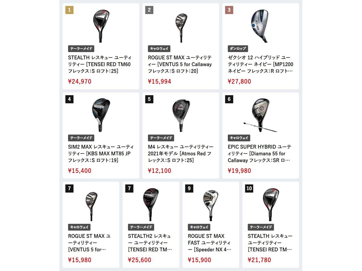 10位にも同モデルのロフト違い「STEALTH・TENSEI RED TM60・S・19度」が入っている。7位タイには同社から2023年2月に発売された新商品「STEALTH2・TENSEI RED TM60・S・22度」がランクイン。平均価格 30,265円、最安値 25,600円である。「STEALTH2」は、レスキュー(テーラーメイドでのUTの呼称)専用設計の「アドバンスドICTフェース」を採用。より大きなスイートエリアを生み出すためのモデル別、ロフト別設計で作られている。フェースのセンターでヒットしても、オフセンターでヒットしてもボールスピードをアップし、さらに「ツイストフェース」搭載による安定性と高い再現性を可能にしている。また、新構造のカーボンクラウン、「貫通型スピードポケット」、「Vスチールソール」を搭載し、飛距離性能を保ちながら、さらなる寛容性に加えて高い直進性を兼ね備えたモデルだ。