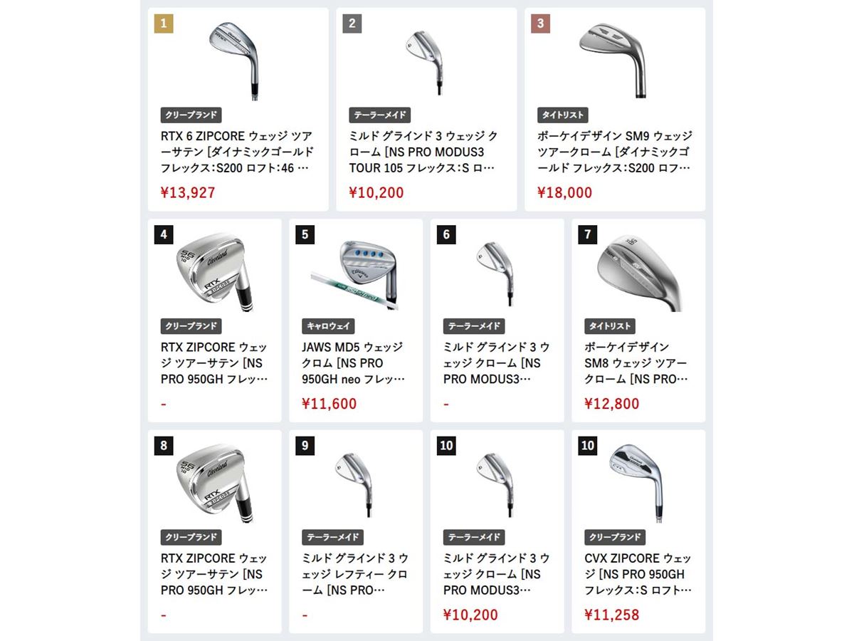 1位には、クリーブランドが2023年3月に発売した新商品「RTX 6 ZIPCORE ウェッジ ツアーサテン・ダイナミックゴールド・S200・46度・10度」が4か月連続でランクイン。平均価格 16,171円、最安値 13,927円で、価格は安定している。ロフト別に異なるフェースブラストとレーザーミーリングを搭載した「HydraZip」フェースにより、ラフやウェット時など芝や砂、水分などがボールとフェースに入り込むような悪条件下においてスピン性能が向上する。また、ネック部にインサートする軽比重のセラミックピンを大型化し、余剰重量を創出。打点位置に近い重心位置を実現し、上下の慣性モーメントを増大させることで、飛距離安定性や方向安定性を向上させている。クリーブランド製品は4位にも2020年9月発売の「RTX ZIPCORE ウェッジ ツアーサテン・NS PRO 950GH・S・50度・10 度」が入っている。平均価格、最安値とも11,000円と低価格で人気である。8位タイにも同モデルのロフト違い「RTX ZIPCORE ウェッジ ツアーサテン・NS PRO 950GH・S・58度・10度」が入っている。ネック内部にセラミックピンを内蔵し、重心位置をフェースセンター寄りにすることで、打球の安定性を向上させている。さらに、余剰重量をトゥ側上部に配置することで、上下の慣性モーメントをアップさせ、打球のばらつきを抑制している。また、新溝設計「ULTIZIP(アルチジップ) GROOVES」は、特に悪条件下でのスピン性能が安定し、フェース溝の耐久性も向上している。