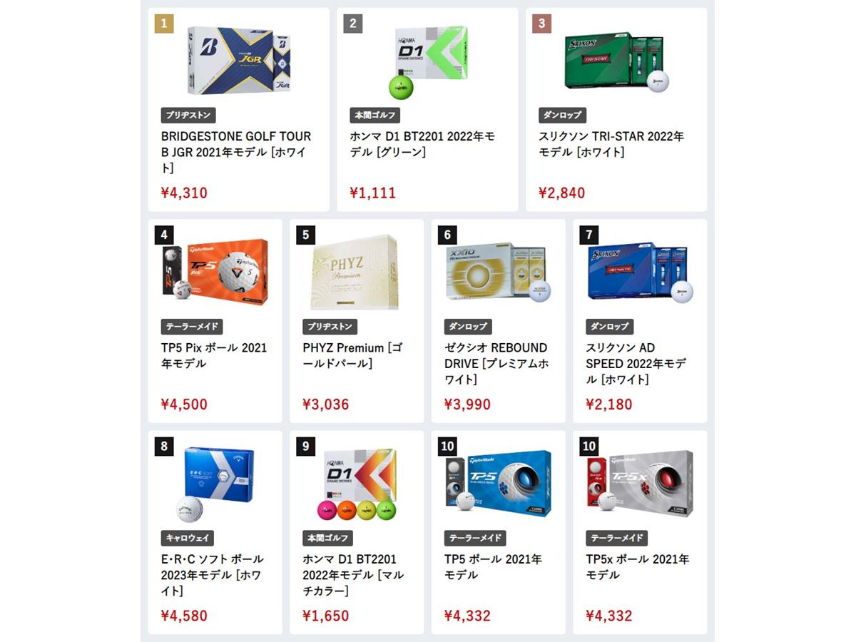 1位は、ブリヂストンから2021年2月に発売されたモデル「BRIDGESTONE GOLF TOUR B JGR 2021年モデル [ホワイト]」が2か月連続でランクイン。同モデルの新商品発売を受けて、平均価格 4,544円、最安値 4,050円と、価格が下がっている。「マッスルコア」をつぶして低スピン、そして復元力で高初速を実現する、飛ばす設計のディスタンス系3ピースボールだ。5位も同社から2014年10月に発売されたモデル「PHYZ Premium [ゴールドパール]」である。平均価格 3,473円、最安値 3,036円。ディスタンス系の4ピースボールで、打感のやわらかさが特徴だ。価格が大幅に下がり、人気が出た。
